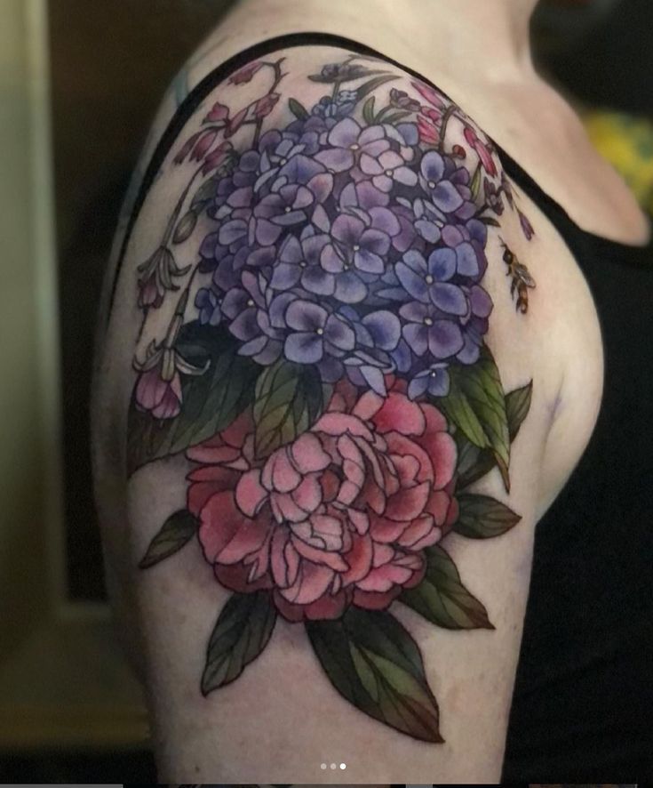 This tattoo is pure garden drama in the best way. A full hydrangea cluster nestles up against bold peonies and trailing leaves, wrapping the top of the shoulder like an ornate floral armor. The mix of purple and pink tones keeps it lush and romantic, while the deeper greens make everything feel grounded and grown-up. It’s a rich, feminine statement that still feels strong—like throwing on a favorite structured jacket over a silky dress.