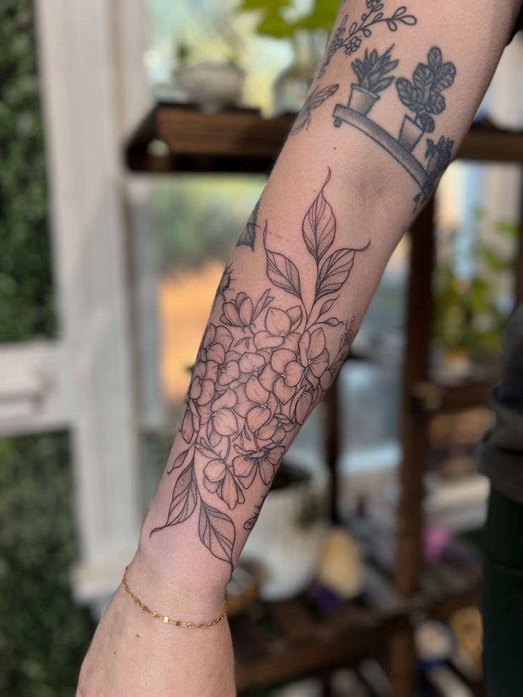 This forearm piece looks like someone sketched a garden right onto your skin during golden hour. The hydrangea blooms spill down the arm with loose, graceful leaves that feel almost windswept, giving the tattoo an easy, organic energy. Because it’s all clean linework, it has that simple elegance that never fights with the rest of your ink or your jewelry. It’s the kind of design that makes you look effortlessly put-together, even when you’re just in jeans and a T-shirt.