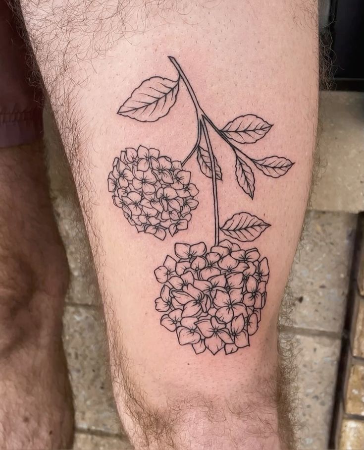 This hydrangea branch keeps things clean and unfussy: just crisp outlines forming two full blooms and a handful of leaves. Without shading or color, the design leans into a fine-line black look that feels graphic and modern, almost like a botanical drawing lifted straight from a sketchbook. It’s a great reminder that florals don’t have to be soft or overly feminine—here they feel strong, structured, and just a bit rugged on the leg.