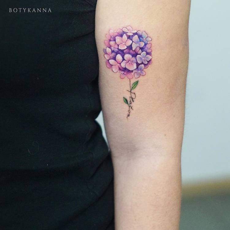 This little hydrangea feels like a love note written on your skin. The bloom is compact and round, blending pink and purple petals that glow softly against the arm, while the stem subtly transforms into flowing script. It’s romantic without being over-the-top, and because the design is tiny, it still feels dainty and personal even with the color. Think of it as a wearable reminder of someone—or something—you’re not ready to forget.