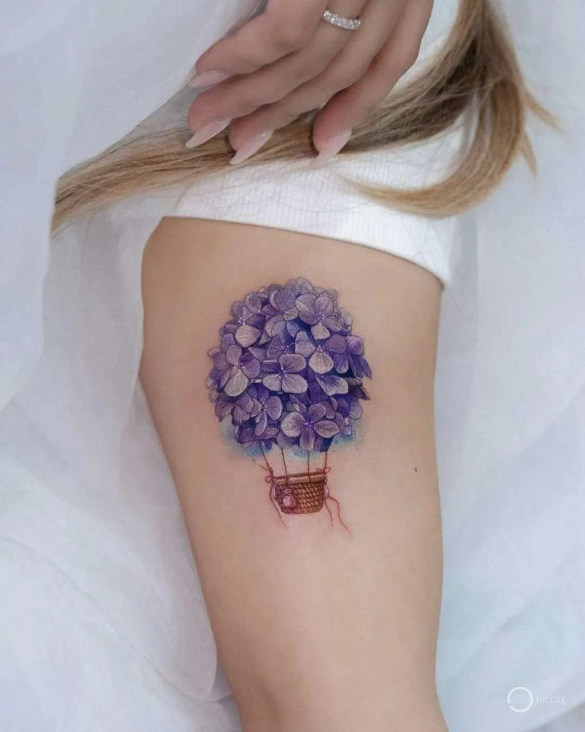 This one is pure whimsy: a hydrangea bloom transformed into a hot air balloon, floating softly in dreamy purple and lavender tones. The basket and little strings make it feel like a miniature fairytale scene, but the execution stays refined enough that it doesn’t read childish. It’s a tiny tattoo with a big personality, perfect if you love the idea of your own private escape route inked right onto your skin.