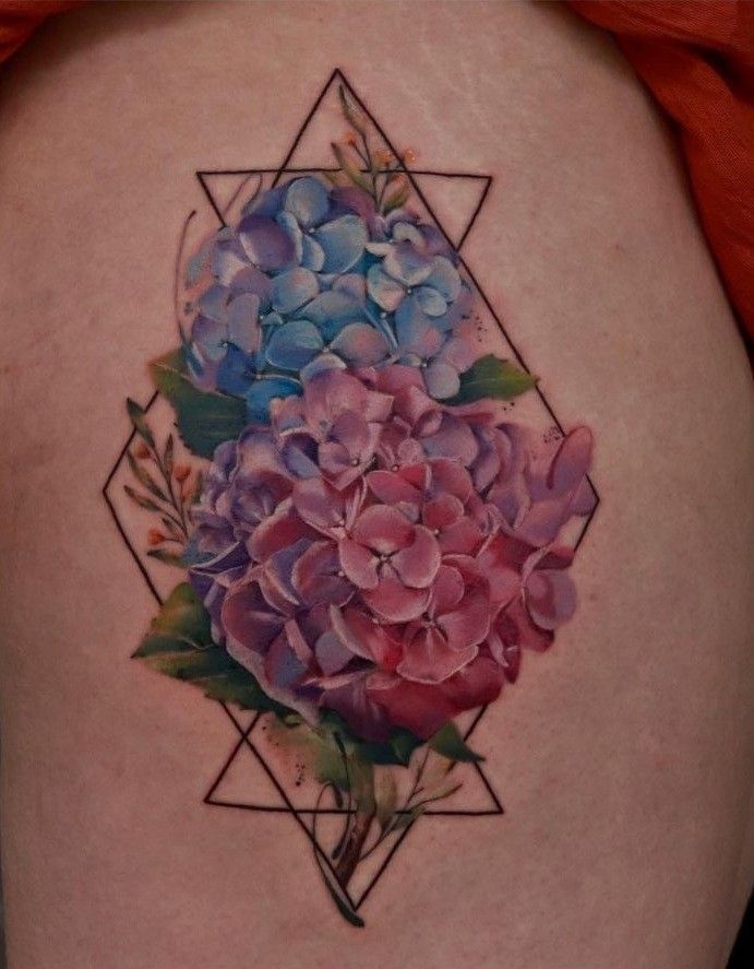 Two lush hydrangea heads—one blue, one pink—sit inside a pair of overlapping geometric outlines, giving this tattoo a surprising mix of softness and structure. The petals are painted with creamy color transitions, while the sharp lines of the diamonds frame them like artwork on a gallery wall. It feels modern and intentional, almost like wearing a carefully curated print on your skin instead of a random floral.