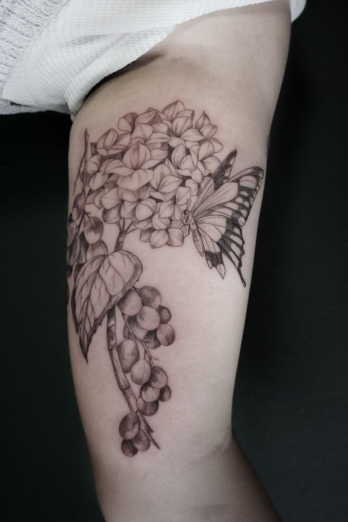 This hydrangea tattoo feels like a quiet little secret you’re keeping just for yourself. The soft petals cluster together while a delicate butterfly pauses as if it’s mid-flight, giving the whole design a dreamy, romantic mood. It has that storybook quality that makes you think of summer evenings, overgrown gardens, and the kind of transformation you only notice when you finally slow down. The shading keeps everything subtle and black rather than loud, so it still feels dainty even though the composition is quite detailed.