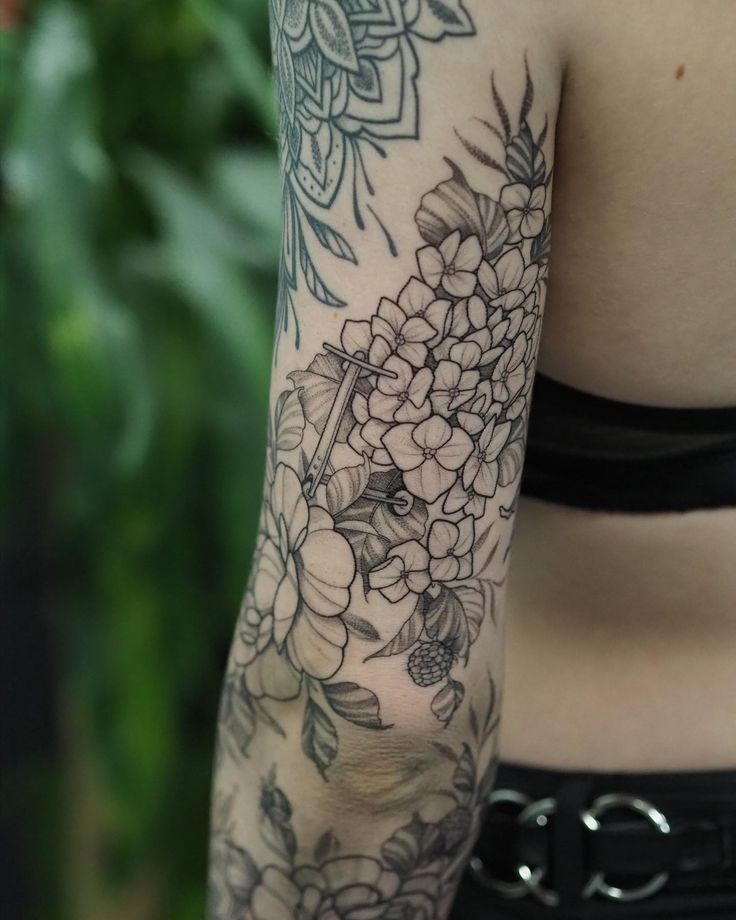 This arm is basically a walking botanical garden. The hydrangeas weave in and out of other flowers and leaves, creating a layered black and white sleeve that feels both wild and carefully curated. The mix of textures—soft petals against sharper foliage—keeps your eye traveling up and down the arm, so every angle shows something new. It’s bold but still graceful, the kind of tattoo that looks just as good with a leather jacket as it does with a floaty summer dress.