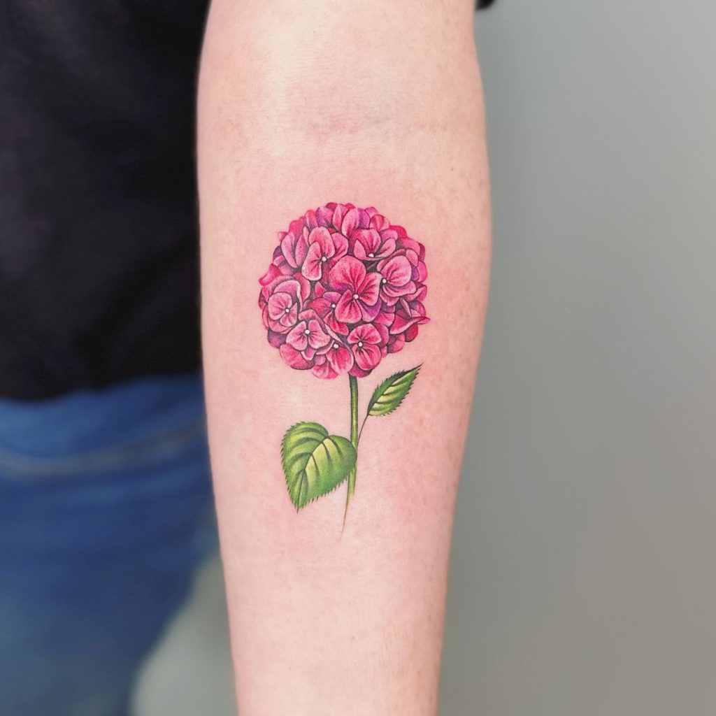This forearm hydrangea is like carrying a little bouquet with you everywhere. The round head glows in saturated pink tones, while the crisp green leaves keep it feeling fresh and lively rather than overly sweet. It’s neat and compact, with just enough detail to feel realistic without losing that simple, graphic punch that reads beautifully from across the room. Think of it as a tiny celebration of yourself that you can see every time you reach for your coffee.