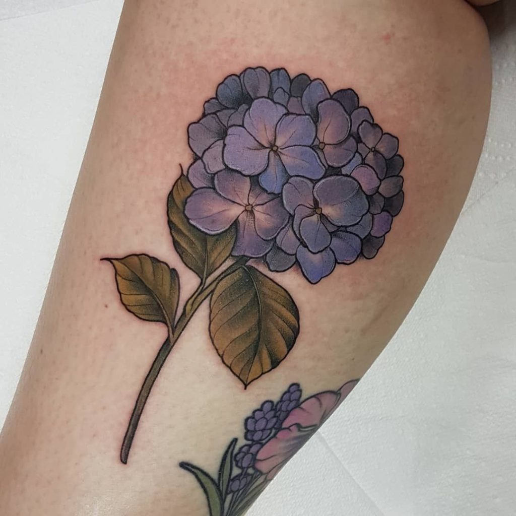 If you’ve been on the fence about committing to larger color work, a contained design like this is such a good first step. It’s big enough to feel intentional but small enough not to overwhelm you, and it sits in a spot that’s easy to admire daily. Let it be your reminder to say yes to more color, more joy, and more bold hydrangea tattoo ideas as you grow into this next chapter.
