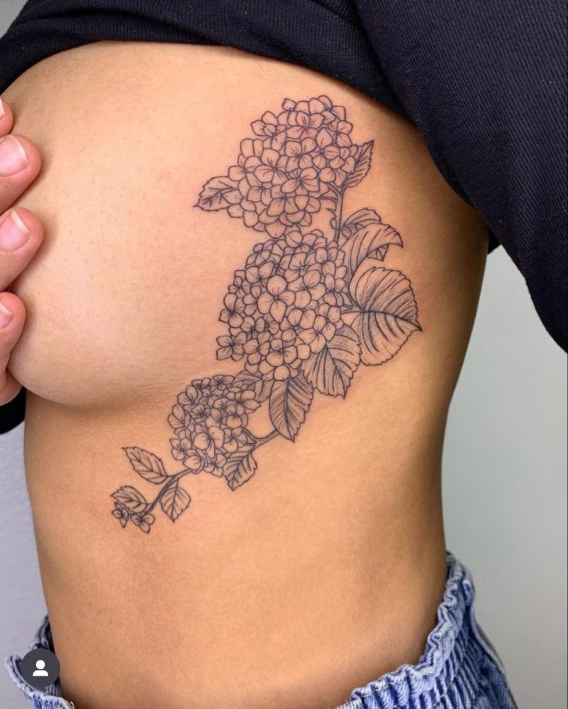 Trailing hydrangea blooms along the ribs feel quietly sensual and incredibly personal. This design uses delicate fine line work to outline clusters of flowers and leaves, letting the negative space hint at softness instead of filling everything in. It curves with the body in a really flattering way, following that natural sweep from under the bust down toward the waist. The overall look is feminine, graceful, and just a little bit wild—like climbing vines on old brick.