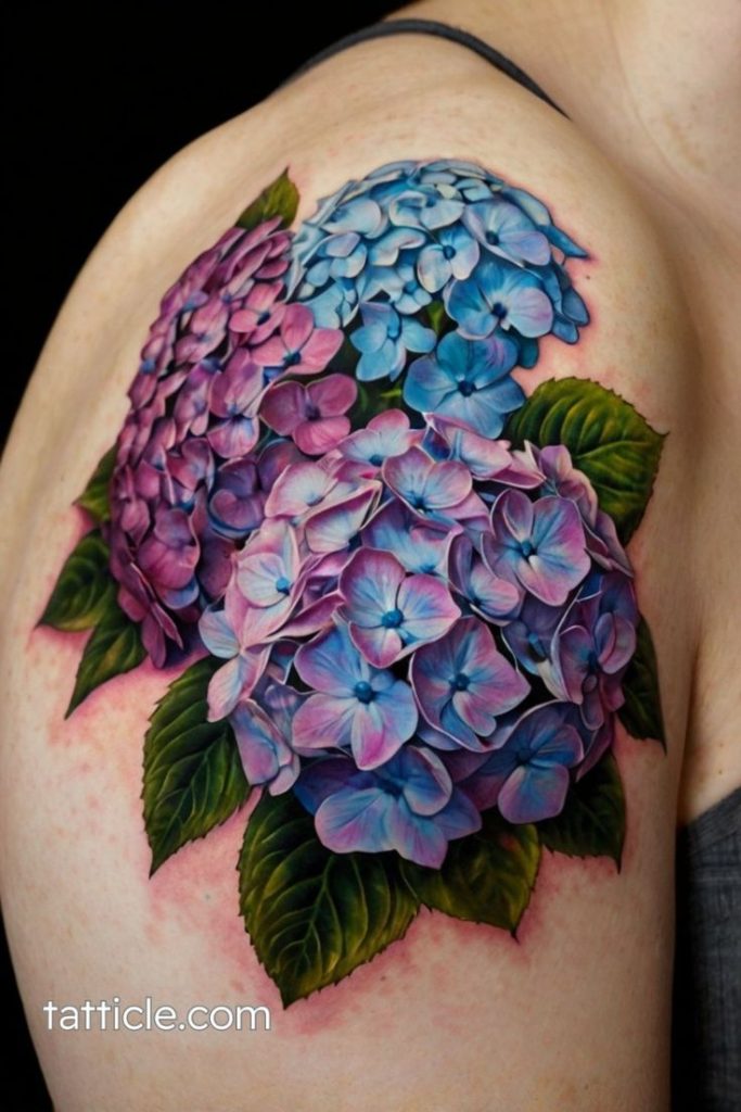 This is the hydrangea tattoo you choose when you’re ready to make a statement. Three extravagant clusters in shades of pink, blue, and violet spill across the shoulder, layered with glossy green leaves that make the blooms feel almost 3D. It has that rich, garden-party energy—luxurious but still playful—like the floral version of a perfectly tailored dress. The curvature of the design hugs the shoulder and back in a way that moves beautifully every time you twist or reach.