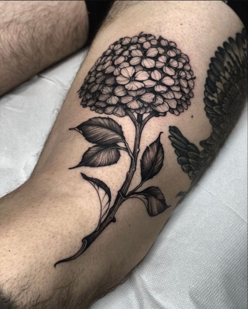3. Bold Single-Stem Hydrangea Thigh Tattoo