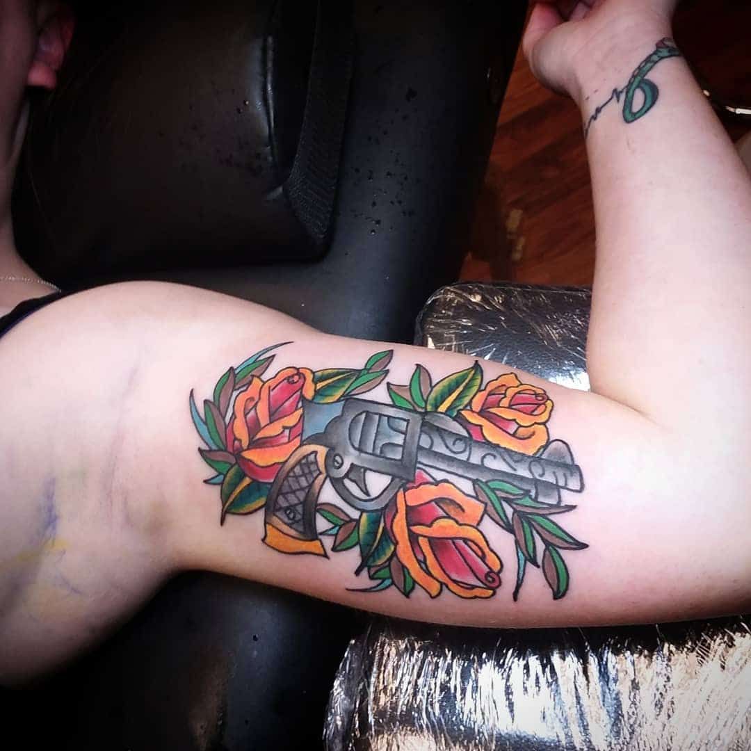 2. Traditional Revolver and Rose Inner Bicep Tattoo