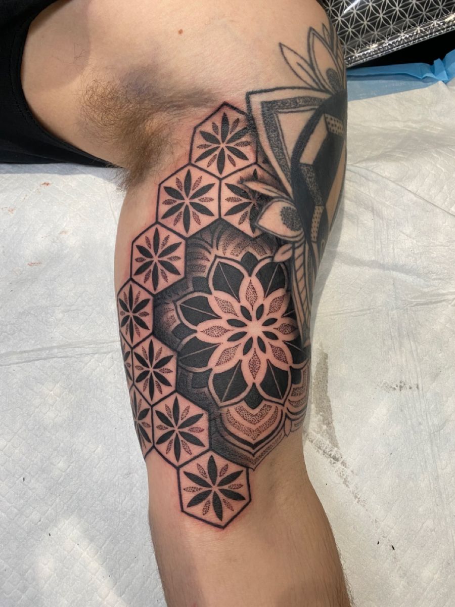 Geometric design ideas for stencil tattoos like this are trending hard because they age well and always look sharp. This style suits men who appreciate structure and precision, and it works beautifully as a standalone piece or the foundation for a future sleeve design.