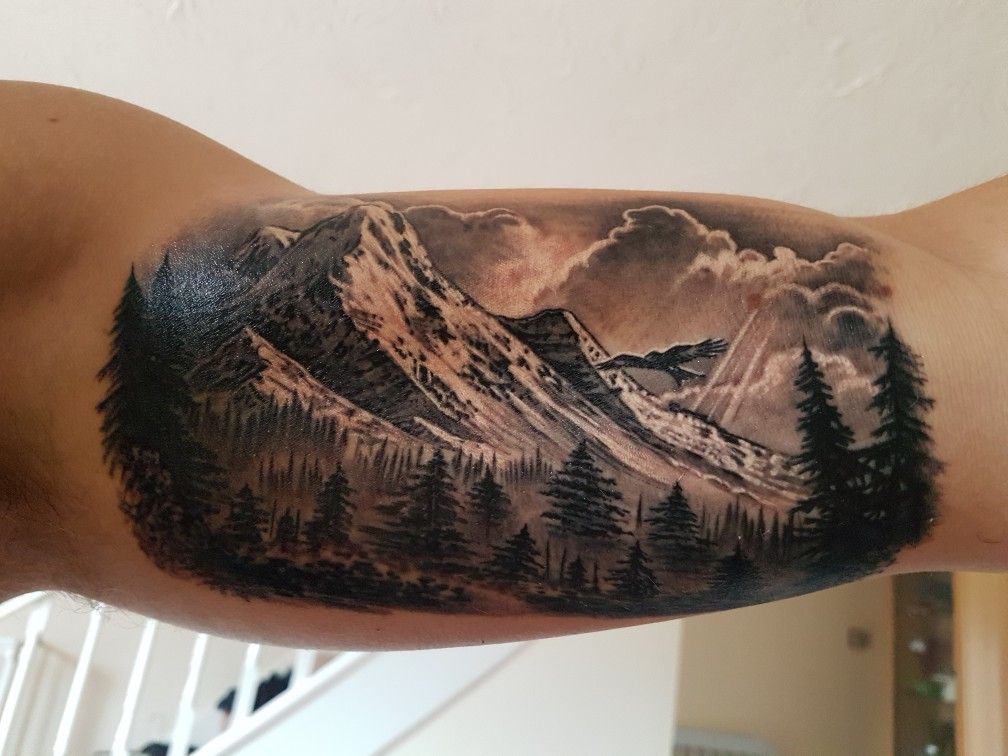18. Mountain Landscape Inner Bicep Tattoo