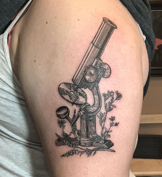 This tattoo is quietly charming and a little unexpected. The old-school microscope feels curious, intellectual, and slightly nostalgic—like a love letter to discovery, science, or a lifelong passion for learning.