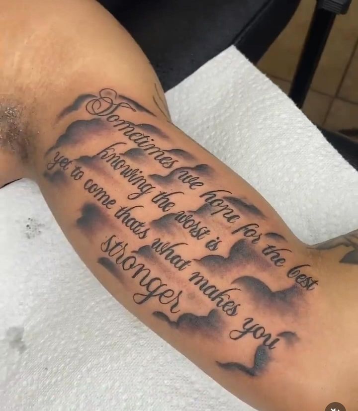 There’s something incredibly intimate about a quote placed on the inner bicep. This one feels heartfelt and honest, like words meant just for the wearer. The soft cloud shading adds emotion without overpowering the message.