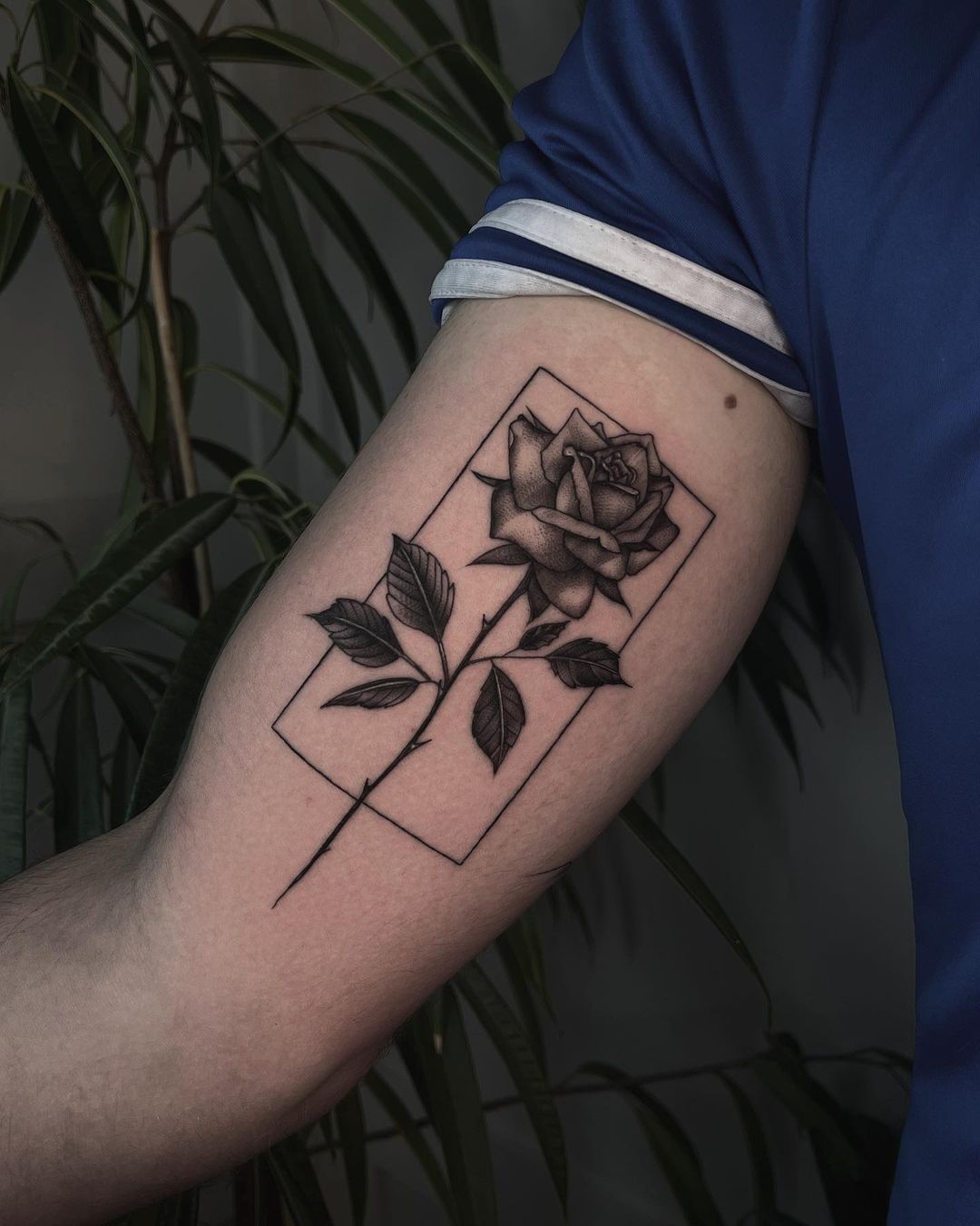 This inner bicep tattoo feels quietly romantic without trying too hard. The rose sits inside a clean geometric frame, giving off that calm, confident energy of someone who knows exactly who they are. It’s not loud, but it lingers—the kind of design you notice twice. There’s softness in the petals, strength in the lines, and a very grown-man kind of elegance that feels intentional rather than impulsive.