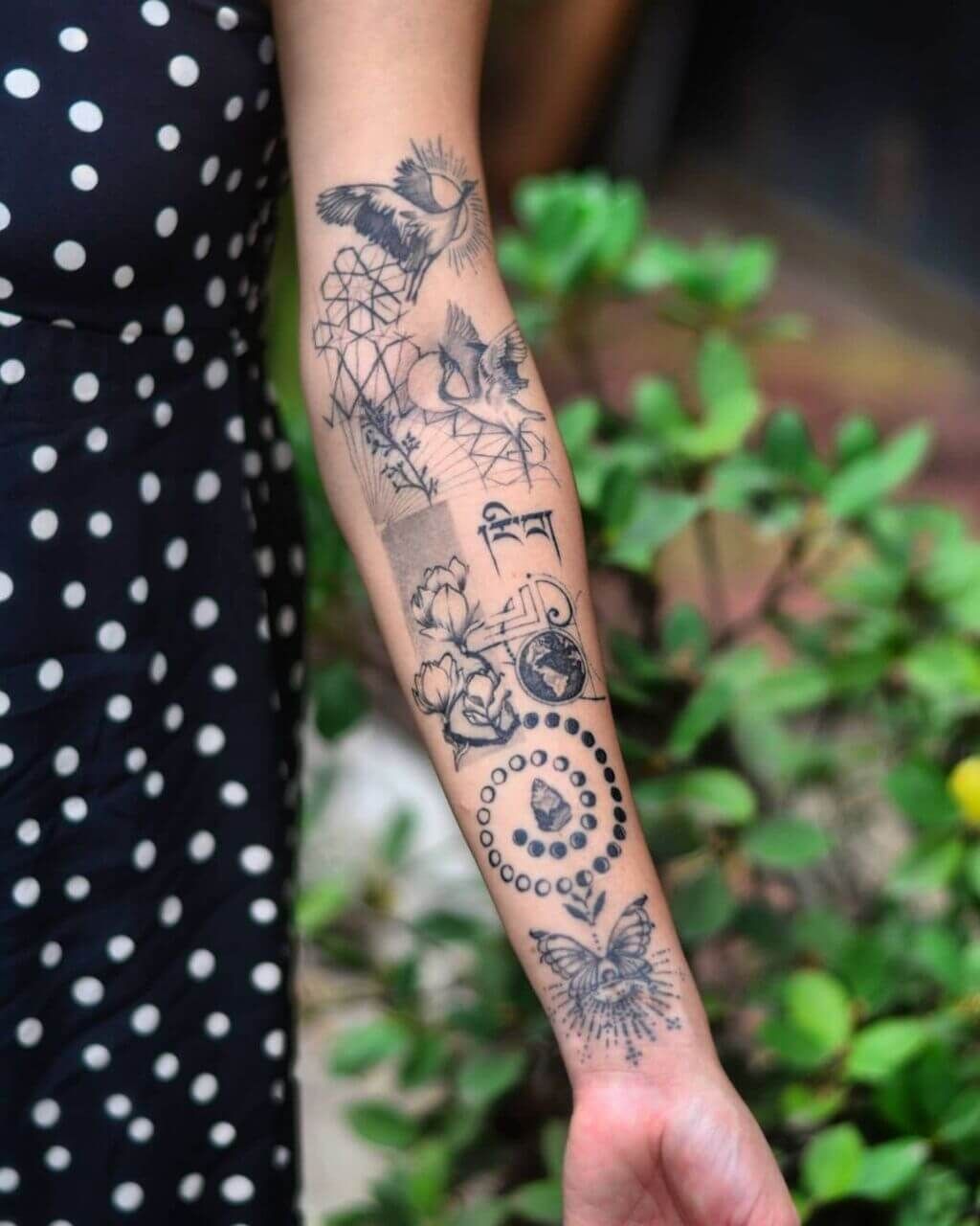 This is for the person who can’t be summarized in one symbol—and doesn’t want to be. It’s a little cosmic, a little nostalgic, and totally “my life is a mood board.” The patchwork vibe feels playful and personal, like you’ve gathered tiny reminders of who you are and lined them up on your inner forearm where you can actually enjoy them.
