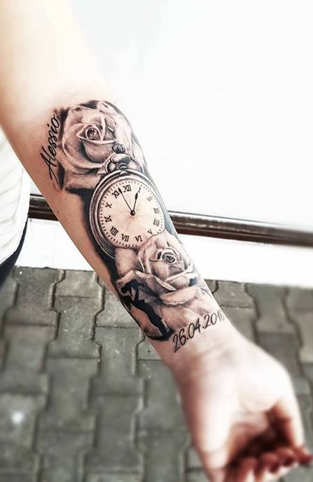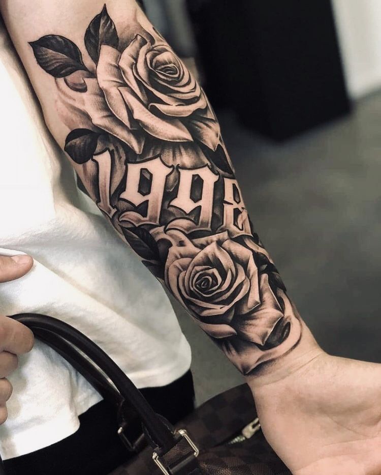This is a great pick for men’s ideas and for women who like bold contrast. If you have medium to thick skin texture or you tan easily, the heavier black-and-gray shading helps the roses stay readable. Keep the lettering slightly spaced and clean so it ages well, and consider placement so the numbers sit straight when your arm is relaxed. If you want a men’s sleeve feel later, these elements expand beautifully into a cohesive men’s design.