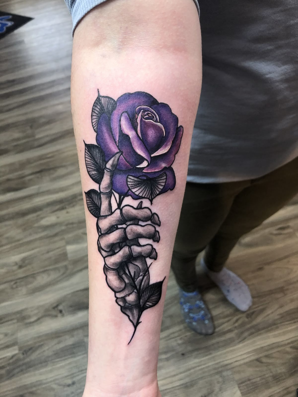 Compared to softer floral-only tattoos, this has more contrast and storytelling, so it’s great if you want a unique design or ideas for a female with an edge. Color plus black shading can age beautifully when the outlines are strong—so prioritize clean borders. If your skin leans dry, stay on top of hydration during healing so the purple doesn’t heal patchy. It also photographs amazingly, which is a fun bonus.