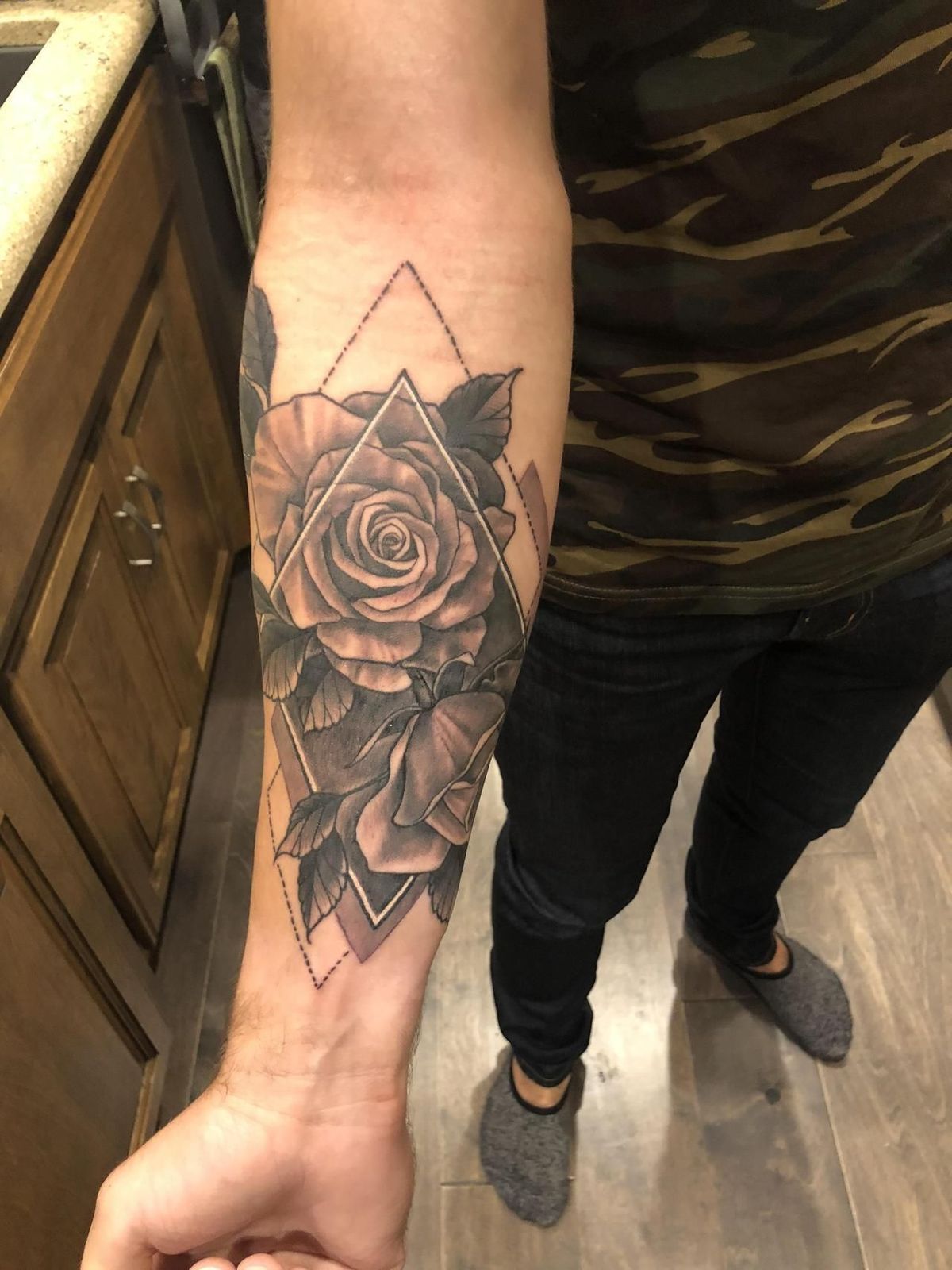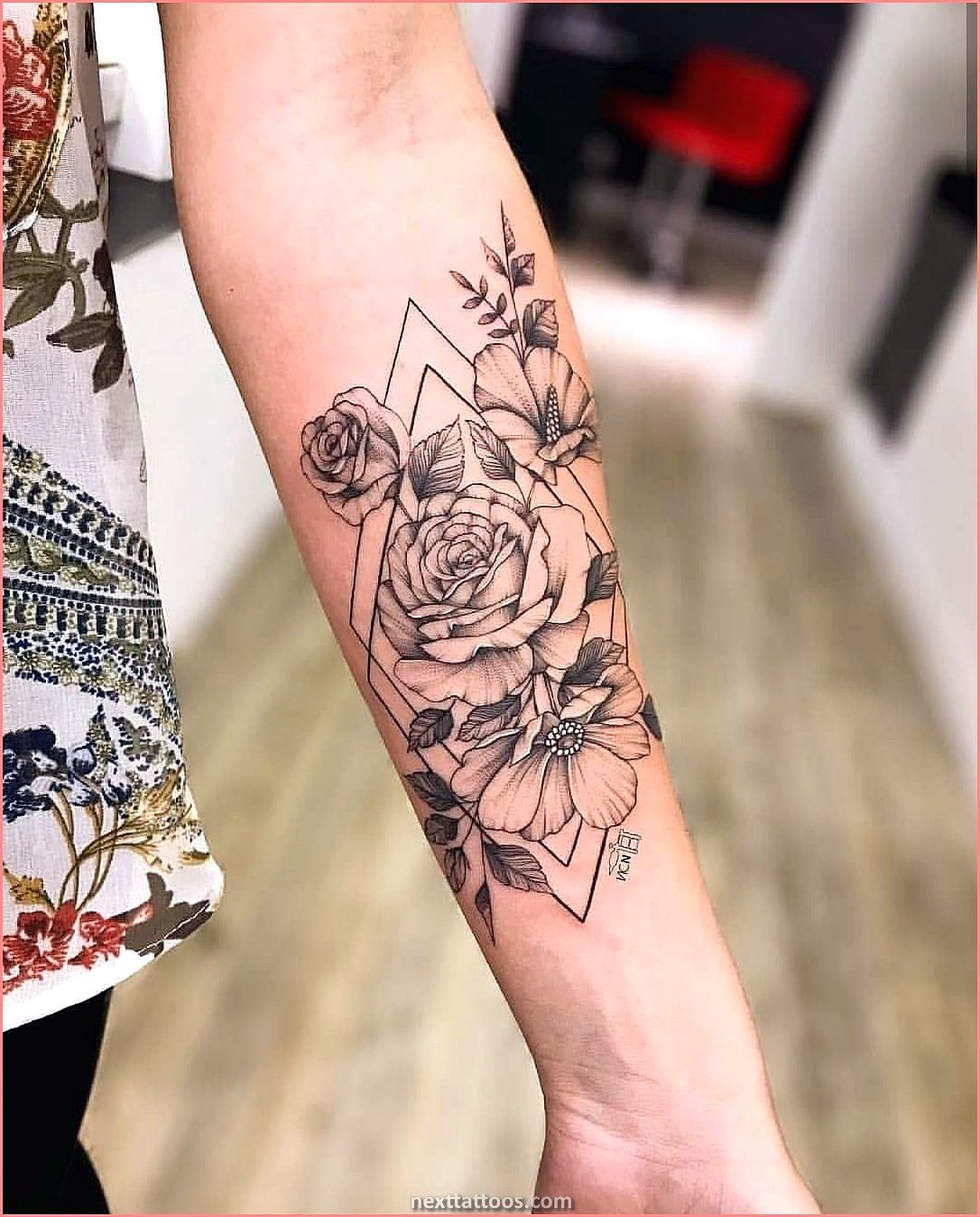 For best results, focus on styling (aka execution): clean straight lines and consistent shading are everything here. It’s a strong men’s design choice if you want something classic but not cliché, and it’s gorgeous for women who like a crisp, graphic look. Ask your artist to map the angles carefully so the diamond stays symmetrical when your arm relaxes. If you ever want to expand into a sleeve, this frame makes adding background shading or extra florals super easy and cohesive.