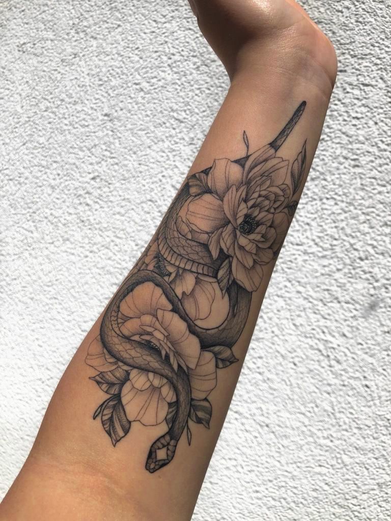 This one feels like quiet power—like you’ve got a soft heart and sharp boundaries, and you’re finally okay with both. The way the snake glides through the floral blooms gives it that “don’t underestimate me” energy, but it’s still romantic and graceful. It’s the kind of inner forearm tattoo you catch in the mirror while washing your hands and think, Yep… that’s me.