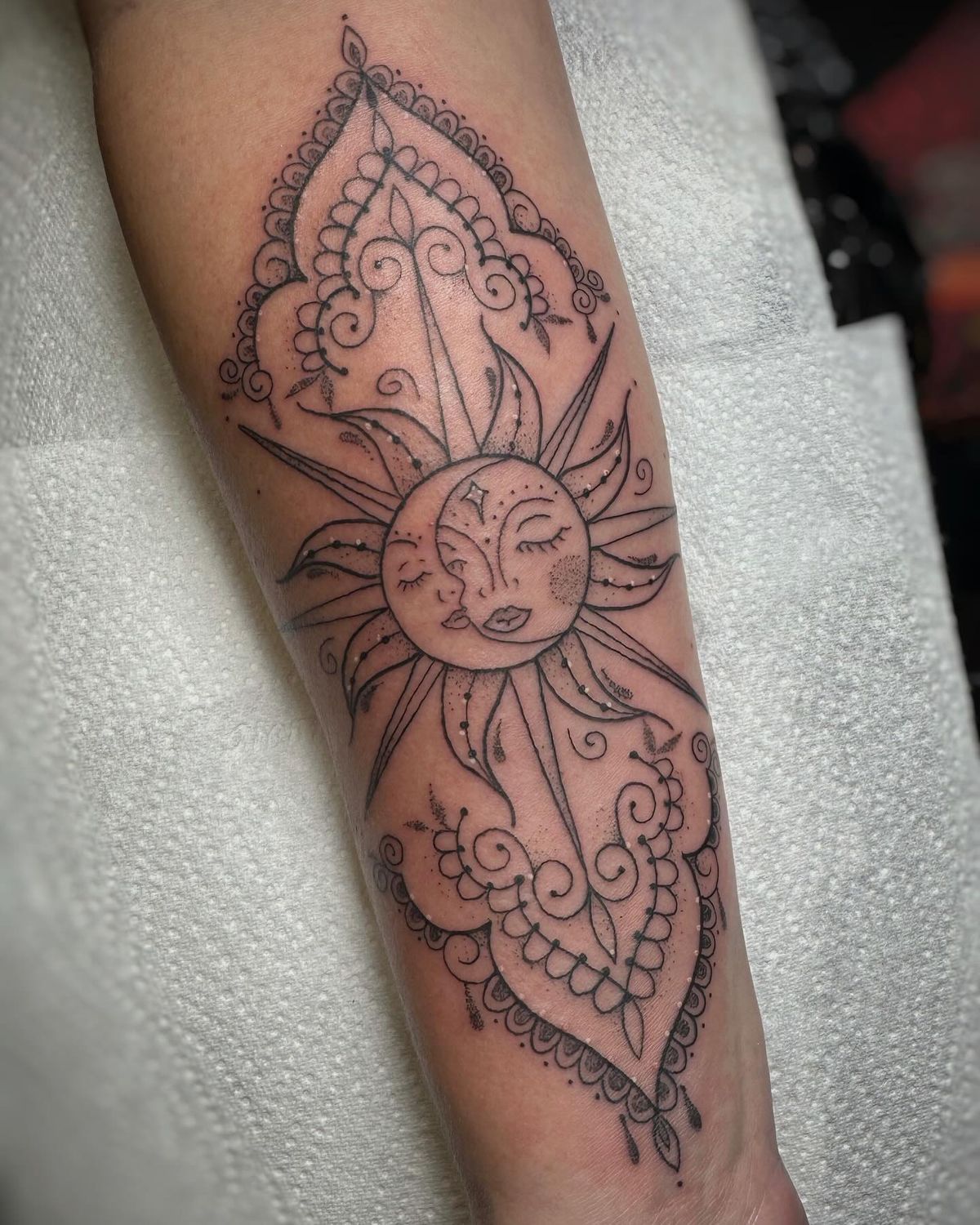 The vibe is celestial and serene, so it’s perfect if you want your tattoo to feel grounding instead of aggressive. It flatters most arm shapes because the design is naturally vertical and balanced. Go with a stencil-first approach so the symmetry stays crisp, then add fine dotwork for texture. This is also a beautiful, simple option for women if you want detail without heavy shading, and it can grow into a sleeve with matching ornamental patterns.