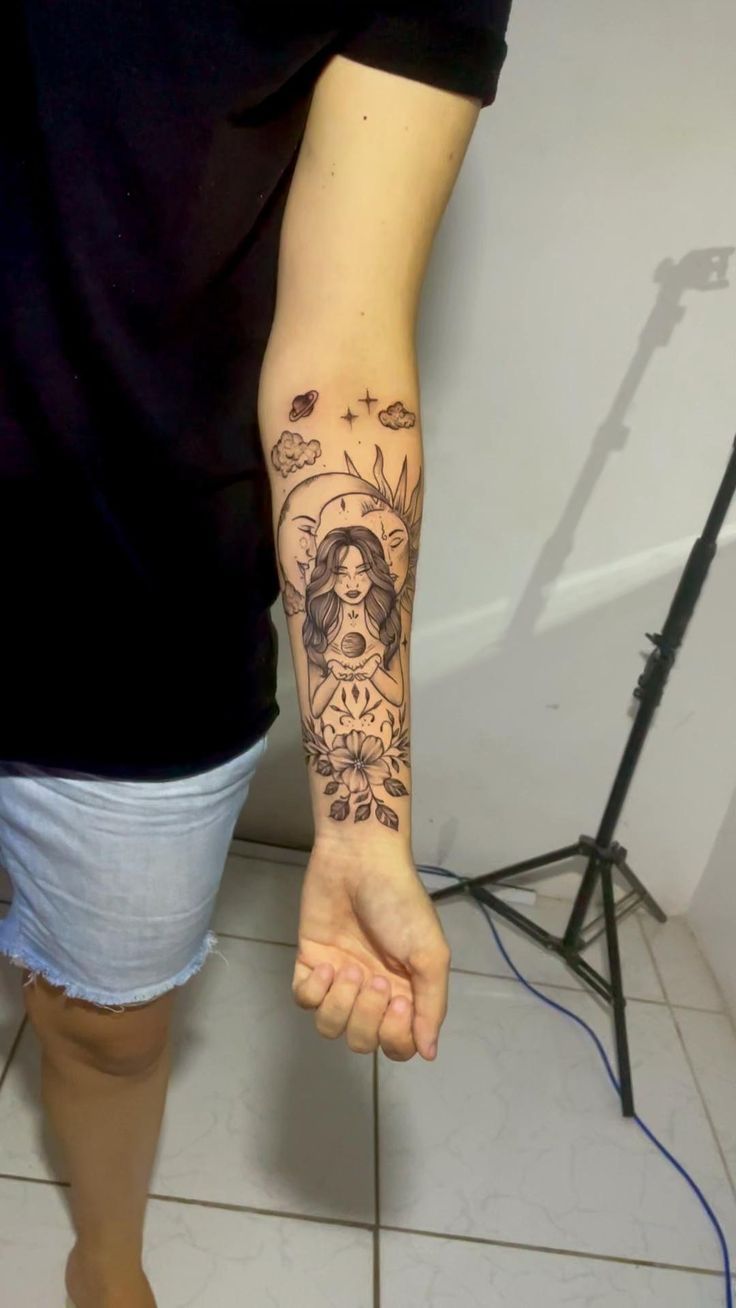 This one feels like a whole personality—mystical, dreamy, a little wild, and totally unforgettable. The feminine portrait energy gives “main character,” but the celestial details keep it from feeling too literal. It’s like you’re wearing your intuition on your skin, and honestly, I love that. This is the kind of inner forearm tattoo idea that starts conversations without you having to do the talking.