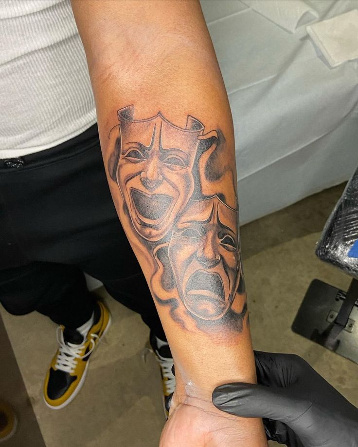 This tattoo feels like you’re saying, “Yep, I’ve lived a few chapters”—and you’re not hiding any of it. The theatre masks bring that classic mix of laughter and heartbreak, the kind of emotional honesty that looks tough at first glance and deeply human once you really sit with it. It’s dramatic, yes, but not in a messy way—more like a confident spotlight moment that turns your inner forearm into a personal symbol.