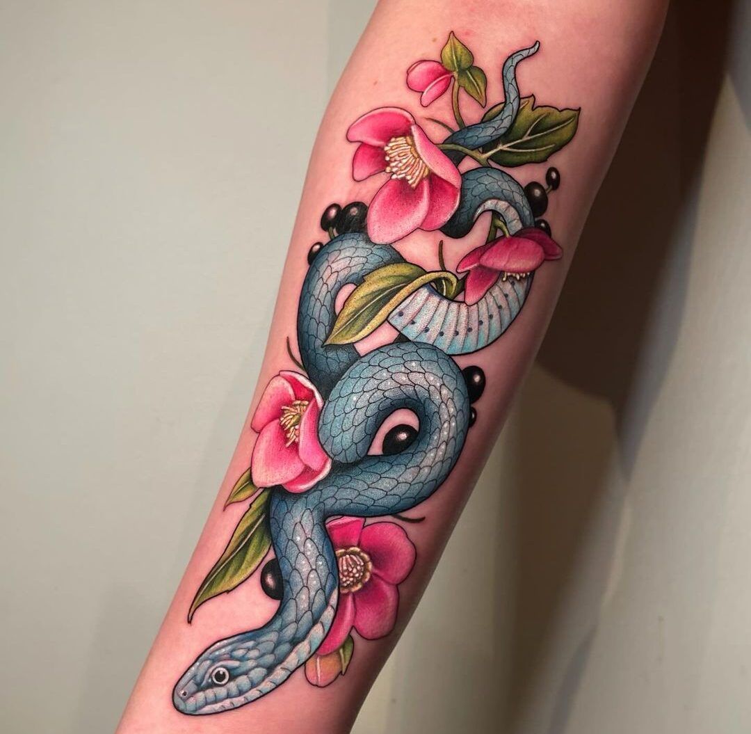 Okay, this one is a whole moment. The color feels like a confident lipstick—bold, playful, and impossible to ignore in the best way. The snake adds edge, the pink blooms add sweetness, and together it reads like, “Yes, I’m soft… and yes, I bite.” If you want inner forearm tattoo ideas that feel fresh and fun, this is the kind you build an entire vibe around.