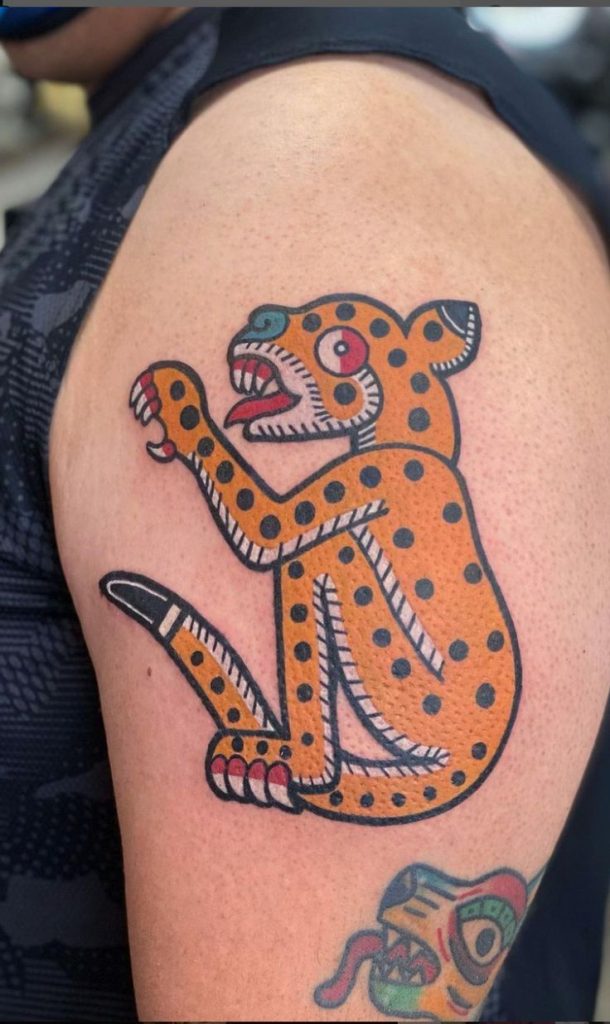 The first one we’ve seen today, and possibly one of the most interesting, is this Aztec-style codex-inspired jaguar icon, with its bright and whimsical orange and red color scheme, its simplified black border, and its adorable graphic spots that seem like they were taken right out of an ancient civilization’s holy texts. This design has serious potential if you want to make your upper arm your own personal art walk, replete with outrageous teeth, scallops, and your own personal versions of ancient icons. Since this design is so heavily influenced by Aztec and Azteca themes, it goes hand in hand with minimalist designs. Sport it with minimal fashion, popping against plain black shirts, chains, and perhaps a patterned bandana, or keep it elegant with tailored fashion designs so that your tattoo can be the focal point. It is an exemplary choice, in particular, for those with an interest in designs and culture rather than photo-realistic animals, allowing you to effortlessly build a sleeve with Mexican designs, patterned stripes, and perhaps even traditional skull designs around your tattoo.