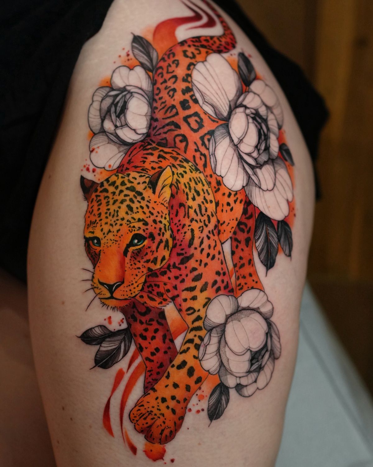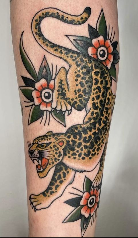 Such color art calls for some TLC. To keep those red and orange hues radiant, you should handle this tattoo job as you would your favorite silk blouse—moisturize, avoid direct sunlight, and consider retouches in bright climates. This design is a great choice for women with fearless and statement-making interest in body art, as well as for men with such inclinations who are not shy about color, preferring their jaguar tattoo designs with an extra dose of avant-garde, not entirely traditional, ideas.