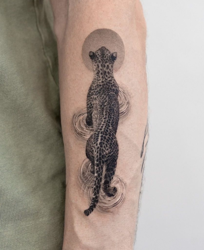 Applied along the forearm or calf, this type of realismo tattoo can be well cared for with a thoughtful aftercare routine, keeping it hydrated and shaded from sunlight so that the delicate nuances in all that dark pigment aren’t lost to time and sunlight by becoming faded and worn, particularly in the striped tail at the back of the jaguar. Because there’s such delicate detail in those black patches, you can be cautious about minimizing friction with tight-fitting clothes, at least until things heal up, and if you prefer your tattoos to be works of art, not garish American traditional-style border lines, you can request your tattoo artist to keep those wavelines thin so that what really shines through is the peaceful, meditative aspect of this jaguar image.