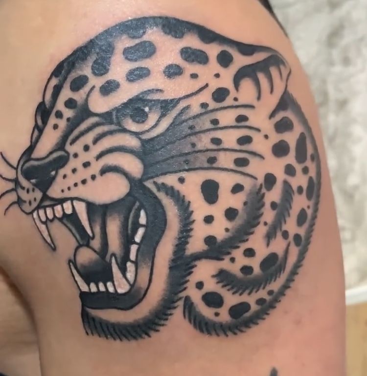 This roaring jaguar’s face is all attitude, with thick black lines, manchas, and that iconic grinning mouth with all its teeth displayed. This has all the marks of sailors’ and bikers’ favorite designs in their purest, most uncompromising form—simple, definitive, and long-wearing. The shading sticks right into the cheek and jawbones, so the face has serious presence without compromising traditional tattoo style one bit. Believe it or not, if you’ve ever sought out tough, uncompromising fashion for your big cats, then this one’s got “don’t mess with me” all over its face, wordlessly and with attitude.