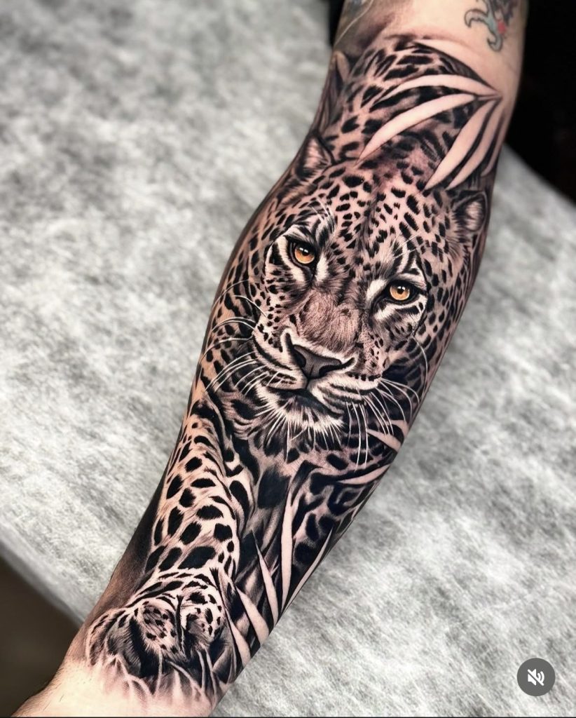 This is what you’d consider if you’ve ever wanted a tattoo that is like an actual movie close-up. The eyes of the jaguar are incredibly sharp, along with its lush fur detail and shadowing that engulf your entire forearm with one massive swatch of ink. All the fur, all the whiskers, and all the manchas de jaguars are treated with such an incredible amount of detail that you’d think at some point, the animal was about to blink. The leaves framing its face provide only a hint of its jungle environment without upstaging the entire portrait with their presence.