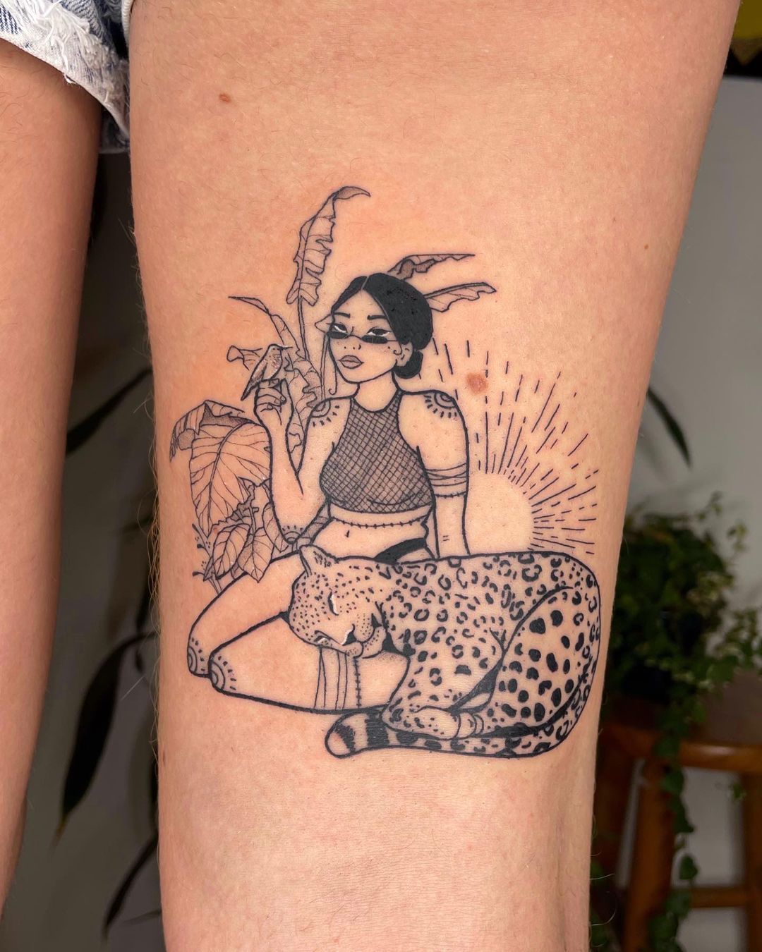 Such story-telling tattoos, like this one, are really big in 2025, and they’re particularly good for women, who may desire not just one symbol but one that represents their world, their body, and all that’s inside it. Rather than, say, having an animal portrait, you get so much more—a story of friendship, strength, and patience, all mixed into one interesting and beautiful design. It’s glorious if you decide to continue with Mexican jungle flowers, Mayan icons, or even such subtle things as Aztec sun designs down the road as you continue your body art masterpiece. You can think of it, then, as chapter one of your personal graphic saga.
