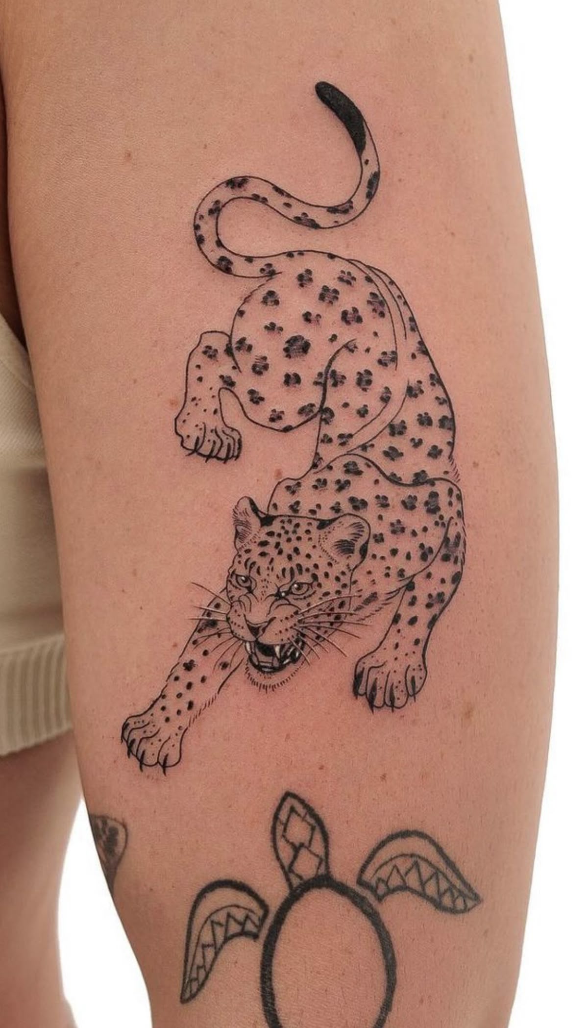 What makes this piece feel so special is the balance between fierce and refined. Unlike more traditional chunky outlines, here the black shading is feathered and soft, which flatters more mature skin and still looks sharp years later. If you love bold animal motifs but don’t want a full sleeve, this is a gorgeous compromise: big enough to feel dramatic but contained enough to hide under a skirt or shorts when you need to. It’s a strong choice for women or men who want a tattoo that reads powerful yet elegant in every season of life.