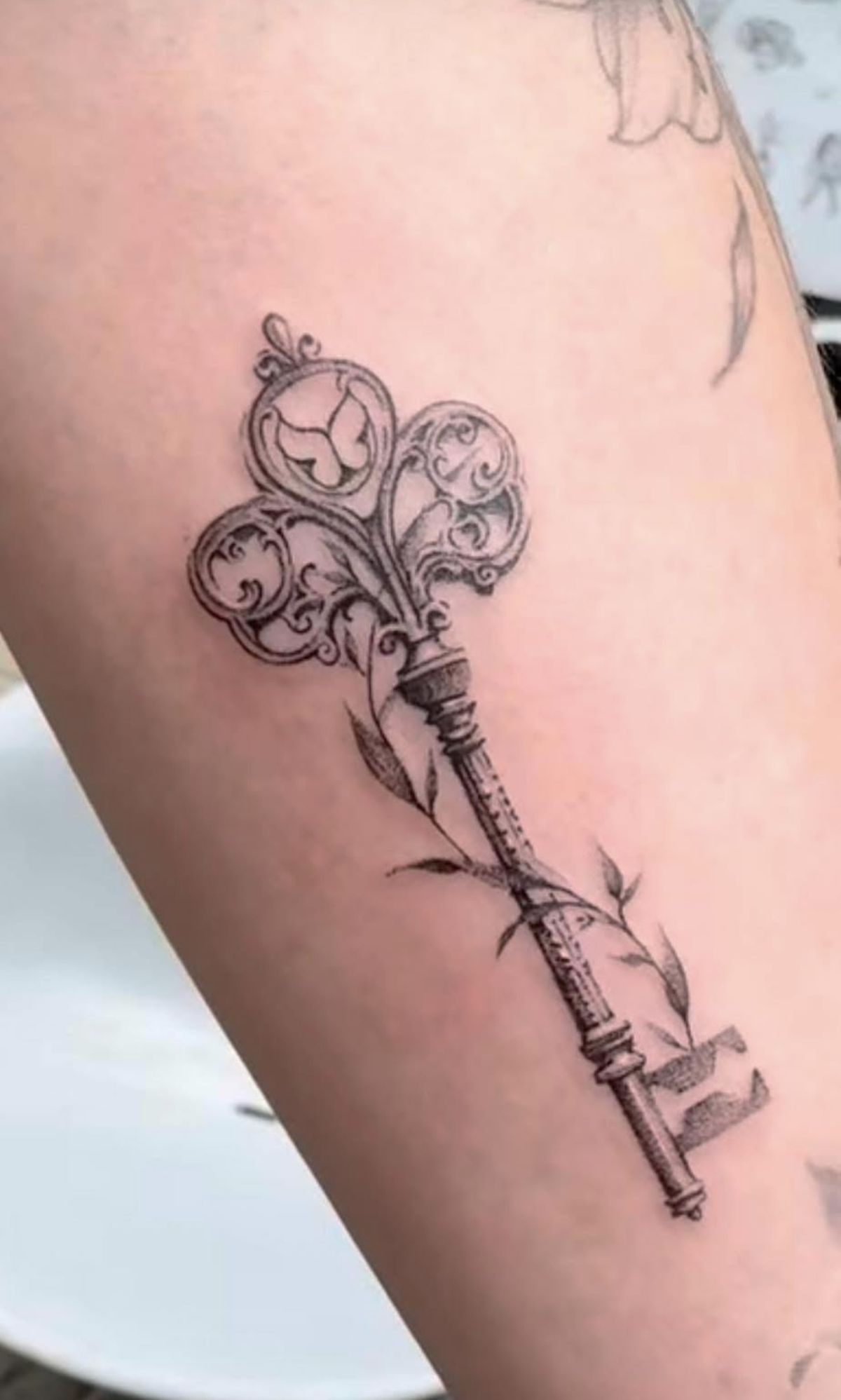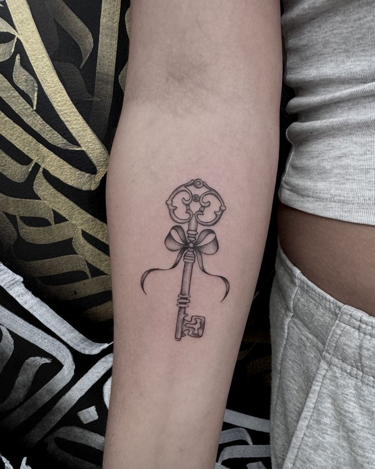 This is a beautiful choice for women who love refined black-and-grey tattoos and want something that feels a little poetic. The slim placement along the inner arm is perfect because it flatters the natural line of the body and gives all that delicate detail room to shine. Compared with a bolder Traditional or Gothic key, this one feels more airy and intimate, which makes it ideal for someone who prefers subtle statement pieces. It also pairs beautifully with soft fabrics, floral prints, and an overall romantic style mood. If your tattoo inspiration leans graceful and quietly expressive, this one absolutely belongs on the shortlist.