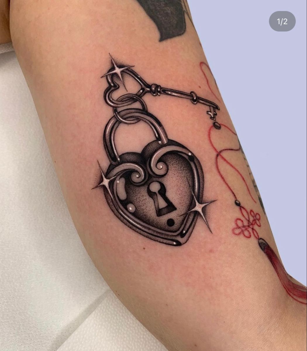 What makes this cut—well, this design—feel special is the balance between softness and edge. The Heart shape keeps it familiar, while the black-and-grey depth gives it a more modern, editorial feel. It’s especially strong for upper arm placement, where the curves can sit naturally and show off the contrast. For women, it reads bold and feminine; for men, it can feel symbolic without being overly sentimental. This style works best when your artist is confident with smooth gradients and crisp highlights, so bring a clear stencil and don’t rush the sizing. Among Lock and key designs, this one feels rich, current, and undeniably eye-catching.