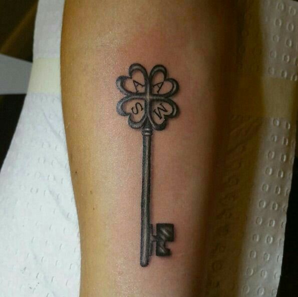 This design is such a smart mix of luck and symbolism. The clover-shaped top gives the key a softer, more optimistic personality right away, and those tiny letters tucked inside make it feel even more meaningful. It’s the kind of tattoo that can stand for family, friendship, or a small circle of people who matter most. There’s also something refreshingly straightforward about it. No extra flourishes, no heavy concept, just a strong shape with a positive little twist. If you want key tattoo ideas that feel uplifting and personal without leaning overly romantic, this one lands in a really lovely middle ground.