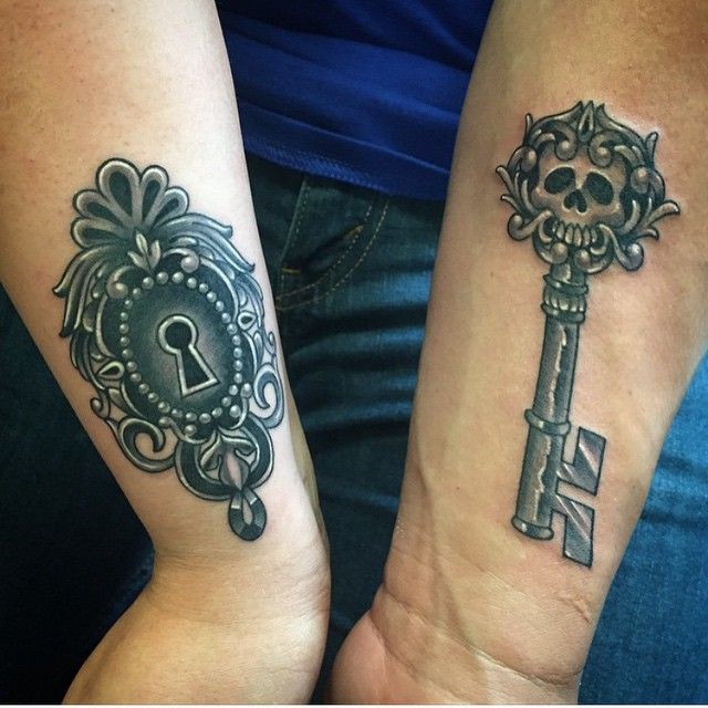 Now this is a duo with serious personality. A richly framed lock on one wrist and a skull-topped Skeleton key on the other create a bold Lock and key concept that feels darker, moodier, and far more original than the usual matching tattoo approach. It has strong Gothic energy, but it’s still polished thanks to the ornate framing and smooth black-and-grey shading. There’s romance in it, yes, but the kind with an edge—more haunted mansion than valentine card. If you’re searching for key tattoo ideas that feel dramatic, symbolic, and a little rebellious, this pairing has exactly the kind of visual tension that makes people look twice.