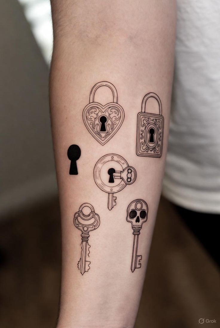 Can’t choose just one style? Honestly, that’s the fun of a small flash-inspired set like this. You get a whole mood board of symbols: Heart lock, classic keyhole, round lock, ornate key, and even a tiny Skeleton key with a skull twist. It feels playful, curated, and a little personal in a way a single larger design sometimes doesn’t. Instead of one dramatic statement, you get a conversation between symbols—love, mystery, memory, protection, maybe even a wink at darker humor. This is the kind of tattoo arrangement that feels creative and slightly offbeat, like someone who knows their style and isn’t afraid to let it evolve piece by piece.