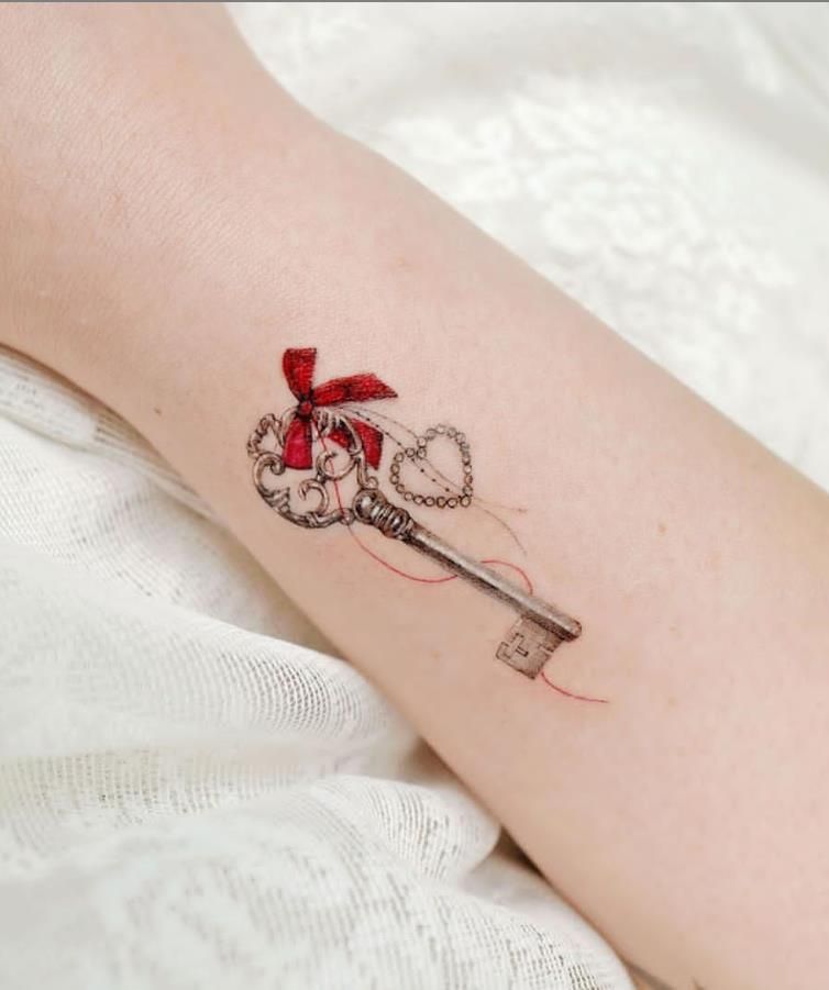This little design is pure charm. The key itself feels soft and timeless, but that tiny red ribbon changes the whole mood—it adds warmth, personality, and a hint of storybook sweetness without making the tattoo look childish. It’s the kind of piece that feels thoughtful rather than loud, like a keepsake turned into something permanent. There’s a lovely Heart-adjacent tenderness here too, especially with the fine chain detail and whispery red thread. If your taste leans romantic, feminine, and slightly whimsical, this is one of those ideas that feels fresh the second you see it. It has a quiet beauty that doesn’t need to shout to be memorable.
