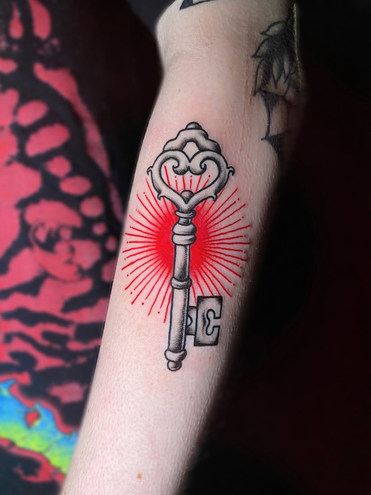 What makes it unique is how it blends soft shading with graphic impact. The black-and-grey key stays classic, while the red burst adds just enough drama to give the tattoo a modern edge. This works beautifully on the forearm, where the vertical placement gives the rays space to frame the design. For women, it reads romantic and empowered; for men, it can feel symbolic and bold without being overly ornate. If you’re considering color but don’t want a fully saturated piece, this is a smart way to do it. It feels fresh, confident, and a little fearless—which, honestly, is a pretty great attitude for any tattoo to carry.