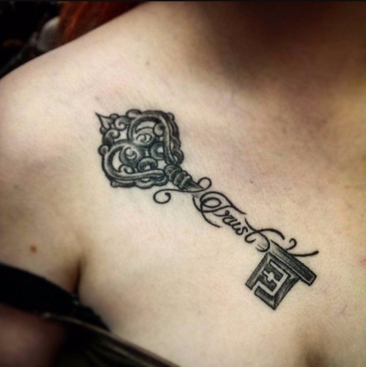 This design has such a sensual, expressive feel to it. The ornate key already brings that Antique elegance, but when you add flowing script through the stem, the whole tattoo becomes more emotional and intimate. It reads almost like a promise, a memory, or a name carried in a more artistic way. And placed near the collarbone, it naturally feels more personal—close to the heart, but still visible enough to make an impression. This is one of those ideas for women especially that feels glamorous without being flashy. It has a soft drama to it, the kind that turns a simple symbol into something romantic, confident, and beautifully lived-in.