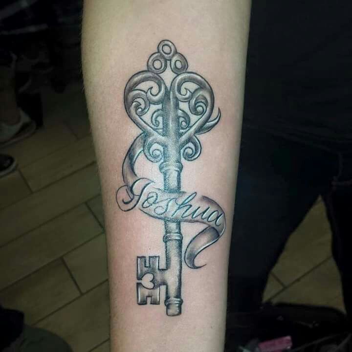 This design has such a sweet, elegant rhythm to it. The heart-like top gives the key a romantic softness, and then the name woven through the stem turns it into something unmistakably personal. It feels like a love note, but cleaner and more stylish than anything overly decorative. There’s a quiet charm in the way the script flows with the structure instead of fighting it, which makes the tattoo feel intentional and feminine without being fussy. If you like key tattoo ideas that hold onto emotion but still look polished enough for everyday life, this one really nails that balance. It’s affectionate, graceful, and easy to connect with.