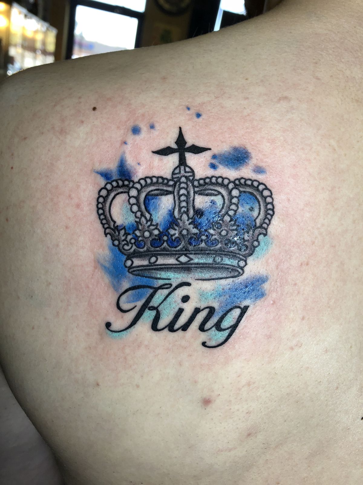 Now this is where things get artistic. The crown with that soft blue watercolor splash feels expressive, almost like wearable art. It’s not just a tattoo—it’s a mood. A little bold, a little creative, and very modern.