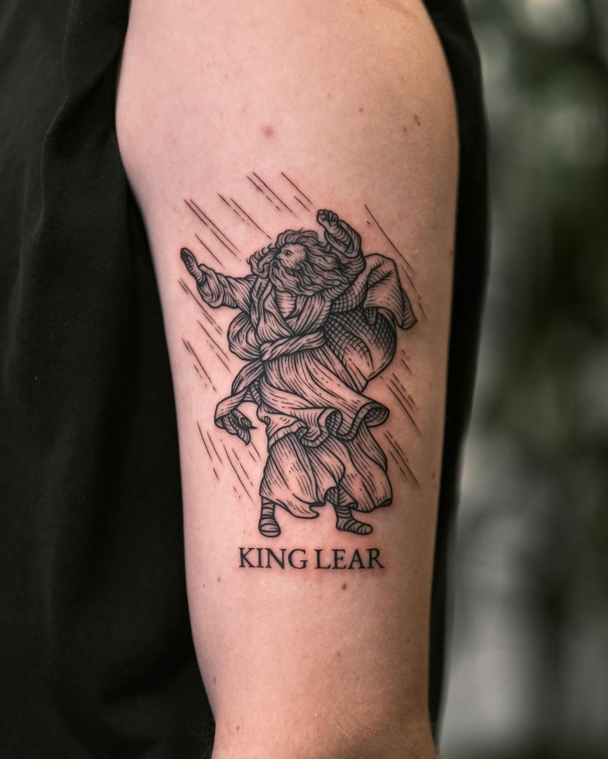 This tattoo feels like a piece of literature brought to life. The figure of King Lear mid-motion gives off drama, movement, and a sense of depth that’s hard to ignore. It’s thoughtful, expressive, and a little intellectual.