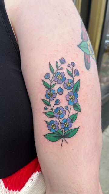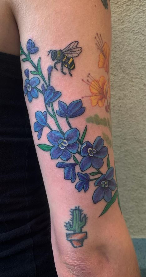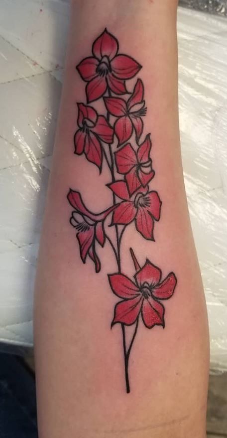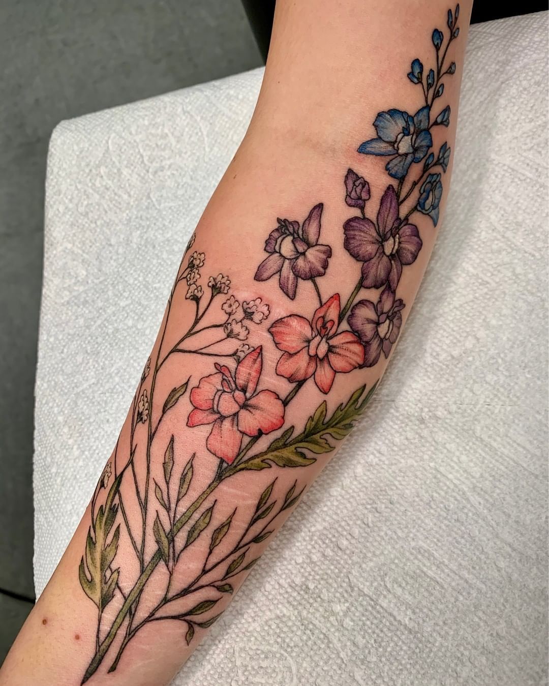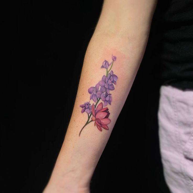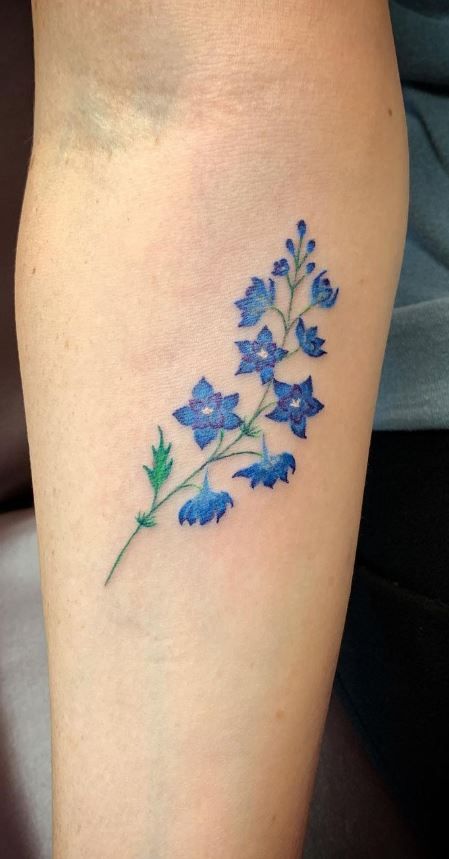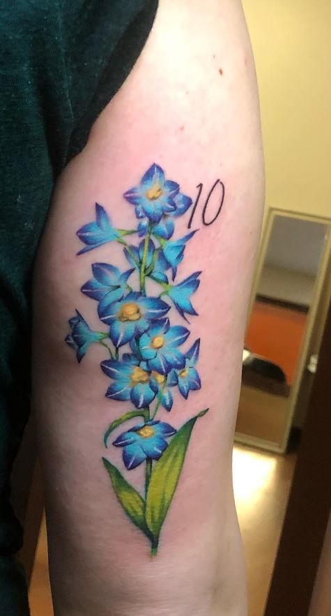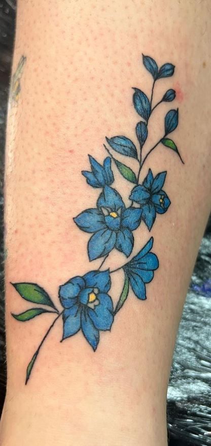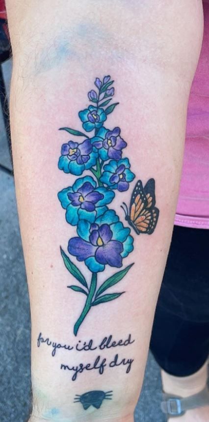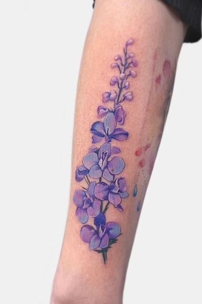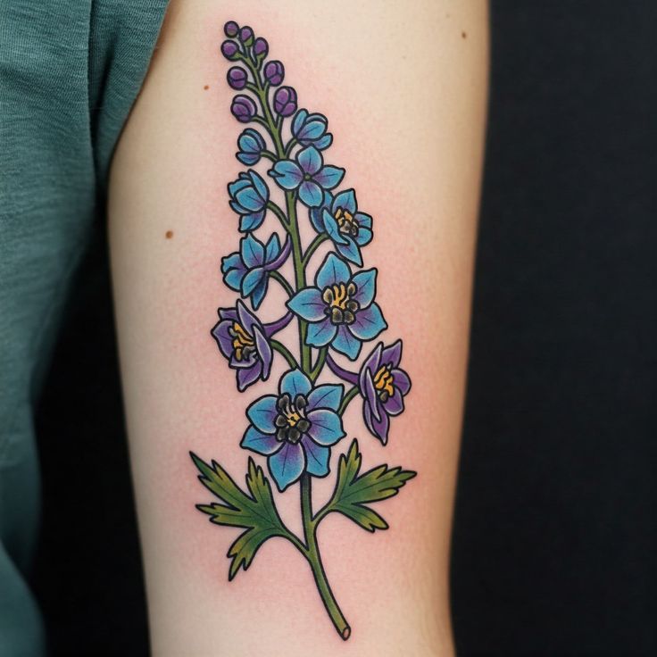 Since this design incorporates color and thicker lines, aftercare means more than you can imagine. Gloss it while keeping a balance of moisturized (not slick), out of pools, and sun-blocked after healing to keep the purple lush. If you want crisp edges, request a clean stencil and solid line weight so it heals sharp. This style looks great on calves, outer forearms, or upper arms—the point is that there’s enough space for the larkspur to “breathe” and not so much wear that the details start to blur.