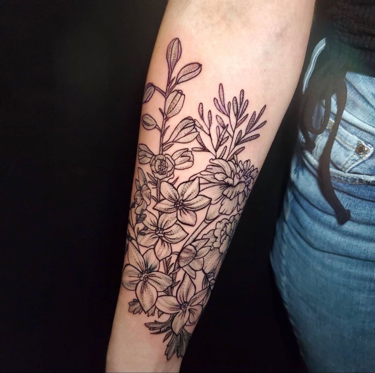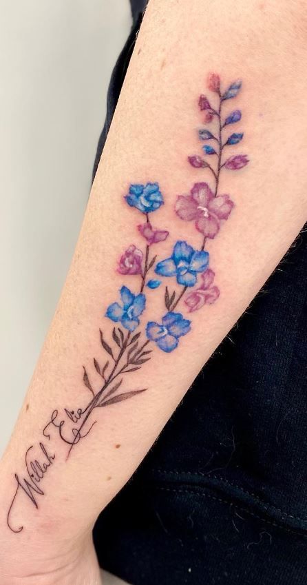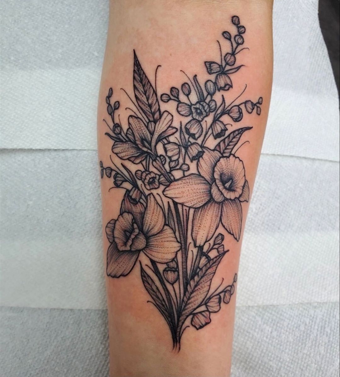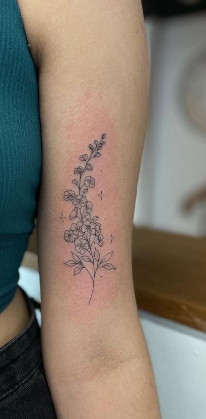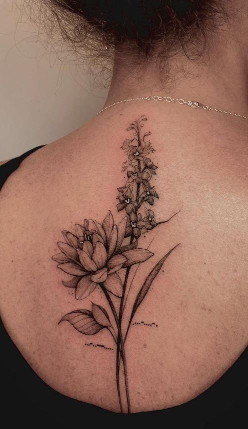 And if you’re indecisive between going for a fine line and one that’s bolder, this falls right in the middle ground—it registers distinctly yet still looks dainty. Blackwork typically ages better and is easier to touch up than a full-color piece, something that harmonizes well with other tattoos in the future. ( You can also customize it by adding a second flower name combination—Rose and Carnation and Daffodil—and keeping the larkspur elements consistent. It’s a very forgiving choice, particularly for the forearm or calf, where the bouquet ends naturally.