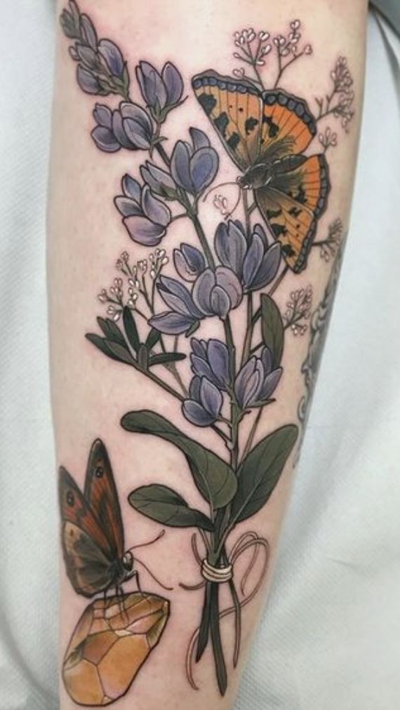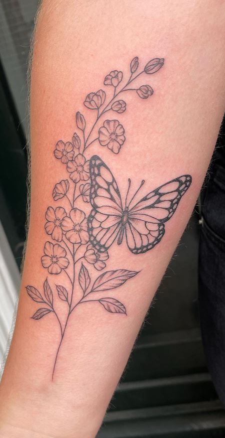 This one is all of the story—the handful of soft blue blossoms, wrapped like a memento, plus butterflies that make it feel slightly magical and somewhat bittersweet. It’s the tattoo version of coming across a pressed flower in an old book and recalling precisely who you were that day. The gem accent gives it that “one-of-a-kind charm” quality, without having to shout for attention.