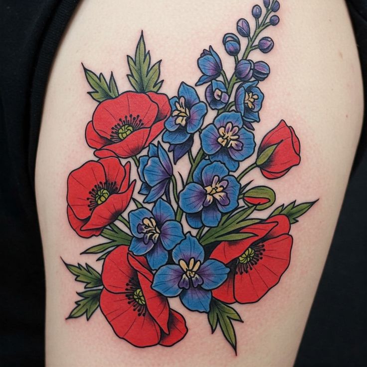 This is the flower tattoo you get when you’re looking for something that looks bold and joyful from 10 feet away. The red poppies are the drama, the blue larkspur adds that cool contrast, and there’s a confidence, that classic punch, in it. It’s like “I know what I want,” with no sorry, not sorry, and no overthinking.